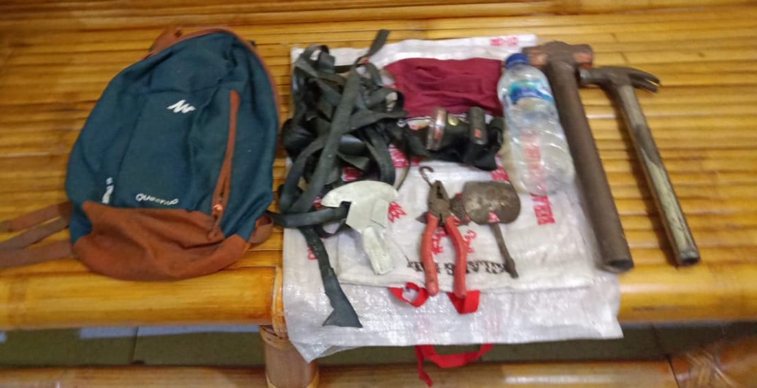 Serta 1 gergaji bergagang kayu, 1 tang gagang karet warna merah, 1 unit senter kepala merk Surya 15 watt, 1 sekrab aluminium, 1 sekrab besi, 6 utas karet ban warna hitam, 1 tas ransel warna biru orange Merk Quenchua, 2 karung plastik beras, 1 potong baju kaos lengan pendek warna merah, 1 masker warna merah, 1 potong baju kaos lengan pendek warna hitam yang bertuliskan Rushout, 1 potong baju kaos lengan pendek warna abu-abu yang bertuliskan Pull & Bear dan 1 botol Aqua ukuran sedang. (ign/mom)