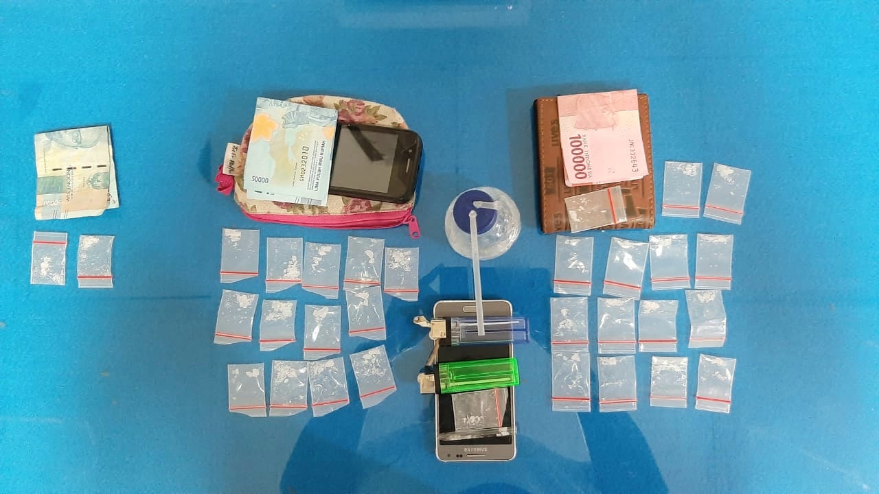 Saat ditangkap, didepan para tersangka ditemukan ada satu unit bong lengkap dengan pipetnya,satu keping pipa kaca pirex yang berisi sabu, satu paket sabu, dua mancis. Dari penggeledahan para tersangka Petugas juga menemukan barang bukti sabu lainnya.