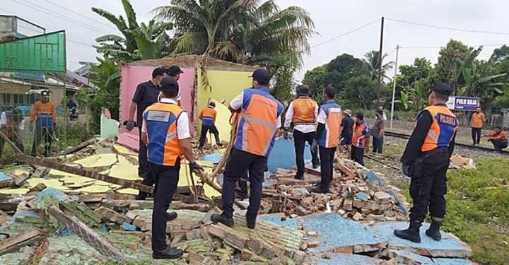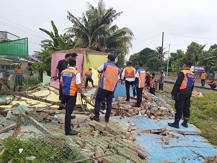 Pembongkaran bangunan di lahan aset PT KAI melibatkan aparat ke polisian Polsek Pulau Raja dan Koramil 16 Pulau Rakyat.