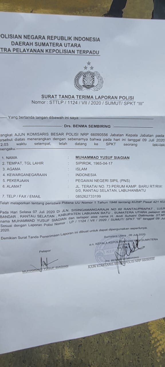 Laporan mereka diterima langsung Kepala SPK III Poldasu, AKBP Drs Benma Sembiring, Kamis (9/7/2020), dengan bukti laporan Nomor: STTLP/1124/VII/2020/SUMUT/SPKT “III”.