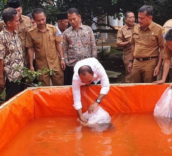Dilokasi bersama Dinas Kelautan, Asisten dan OPD lainya, Bupati menyerahkan dan menabur benih ikan langsung ke kolam plastik atau terpal.