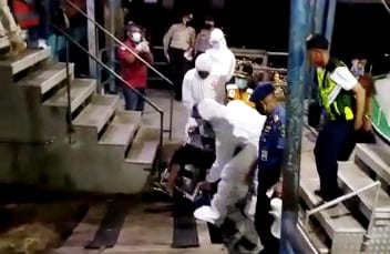 Satu persatu TKI keluar dari Kapal Pacific Jetstar I, dan saat akan memasuki bangunan pelabuhan, petugas kesehatan melakukan penyemprotan desinfektan terhadap tubuh dan barang bawaan para TKI tersebut.