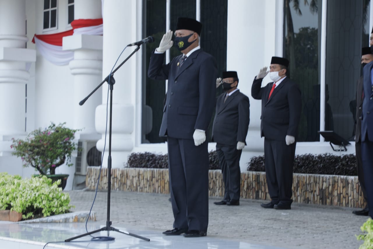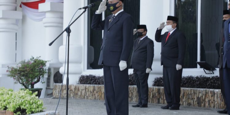 TASLABNEWS, ASAHAN-Bupati Asahan H Surya, BSc bertindak sebagai Inspektur Upacara pada upacara HUT ke 75 Kemerdekaan RI, Senin (17/08/2020) di kantor bupati. Surya berpesan, agar seruluh warga Asahan membuang seluruh rasa benci dan perbedaan, saling bahu membahu dan bersatu untuk membangun Asahan.