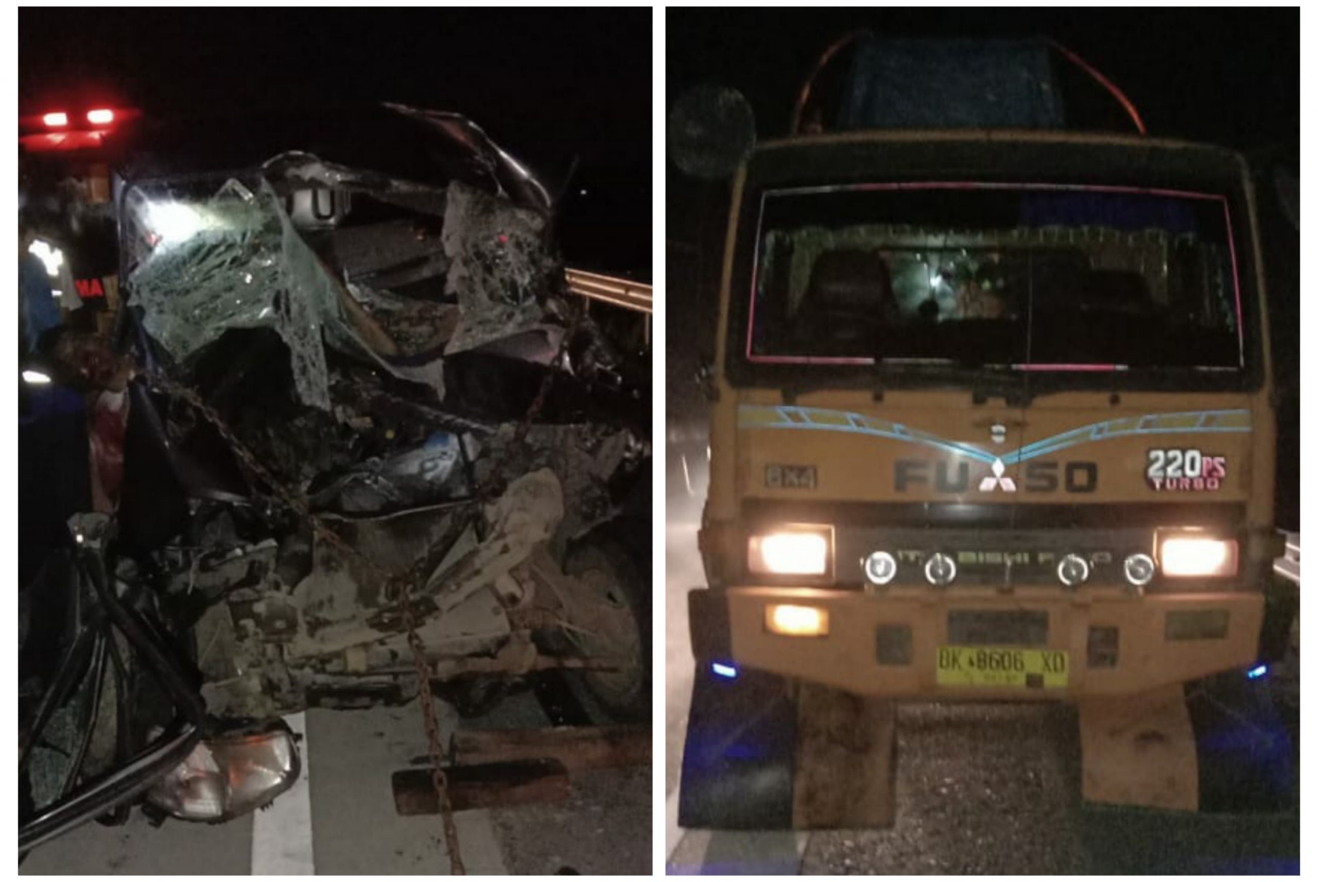 Pihak Sat Lantas Polres Sergai dan Jasa Marga Jalan Tol yang tiba di lokasi kejadian mengevakuasi ketiga korban ke Rumah Sakit Umum Trianda Pasar Bengkel, Perbaungan sedangkan kedua kendaraan dan supir truk diamankan ke Sat Lantas Polres Sergai.