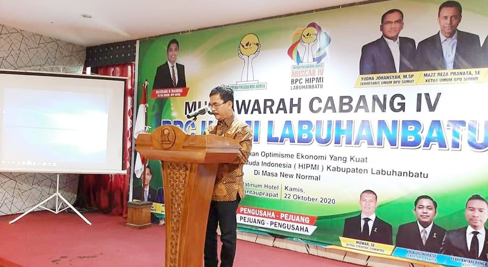 TASLABNEWS, LABUHANBATU – Mewakili Pjs Bupati Labuhanbatu, Kaban Bappeda Kabupaten Labuhanbatu Hobbol Z.Rangkuti menghadiri sekaligus membuka musyawarah cabang (Muscab) HIPMI Labuhanbatu Ke- IV priode 2020-2023 di Platinum Hotel Rantauprapat Kamis (22/10/2020).