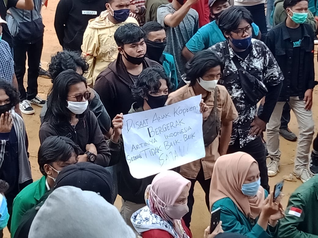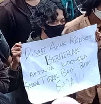 Tidak seperti aksi yang biasa dilakukan. Biasanya, poster atau spanduk yang dibentang bertulis narasi tuntutan. Tapi kali ini tidak. Mereka membawa poster bertulisan, “Disaat Anak Kopteng Bergerak Artinya Indonesia Sedang Tidak Baik-Baik Saja!”