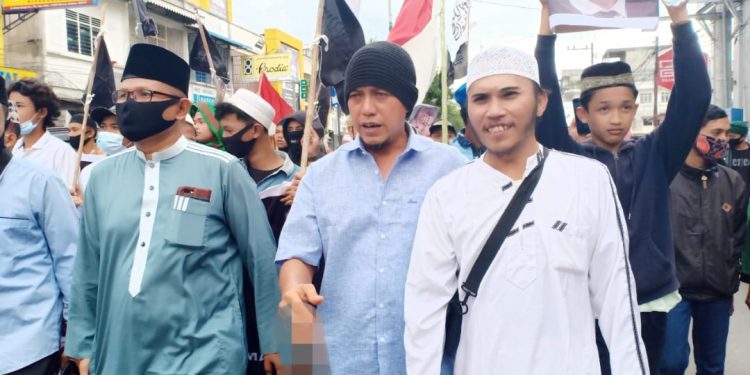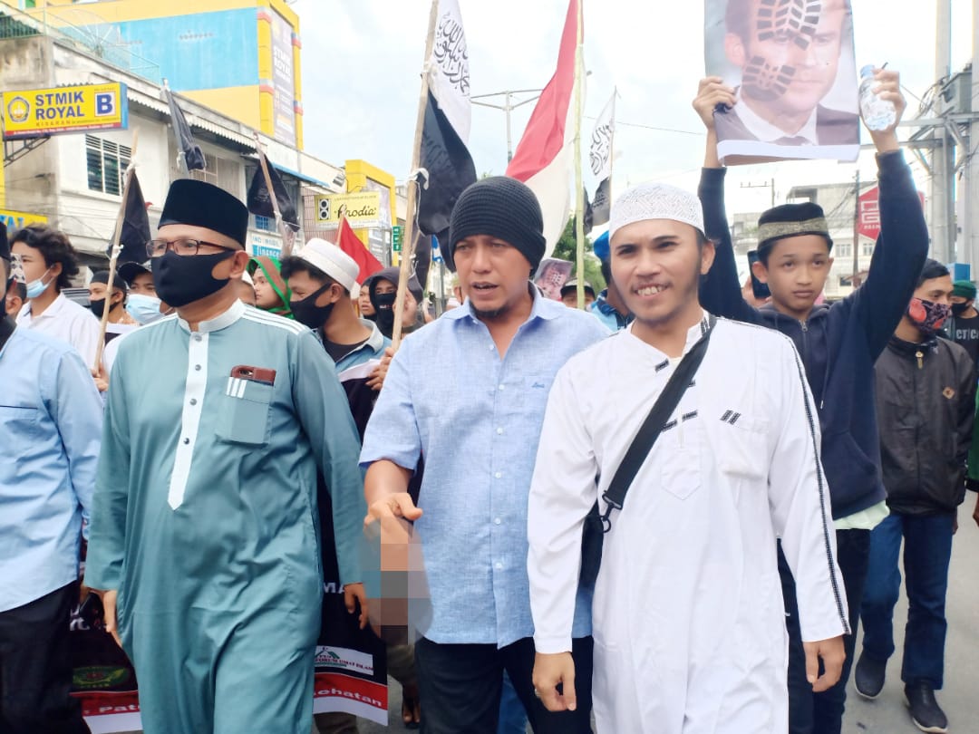Budi Irawan Ketua FUI Asahan dalam orasinya mengecap keras pernyataan Presiden Prancis.