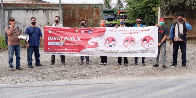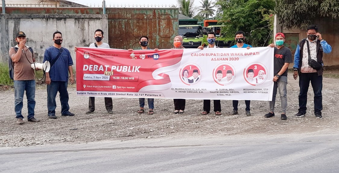 Ajakan tersebut dilakukan menggunakan pengeras suara (megaphone) sembari membentangkan spanduk jadwal debat publik yang akan dilaksanakan KPU Asahan di Hotel Arya Duta, Medan pada Sabtu (07/11/2020) mendatang.