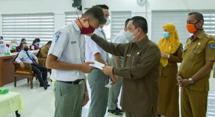 TASLABNEWS, LABUHANBATU –Sebanyak 26 calon mahasiswa asal Labuhanbatu secara simbolis menerima bantuan masuk Perguruan Tinggi Negeri, jalur Seleksi Nasional Masuk Perguruan Tinggi Negeri (SNMPTN) dan Seleksi Bersama Masuk Perguruan Tinggi Negeri (SBMPTN) tahun 2020 yang diserahkan langsung oleh Pjs Bupati Labuhanbatu Drs H Mhd Fitryus SH MSP di ruang Data dan karya Bupati Labuhanbatu, Senin (30/11/2020).