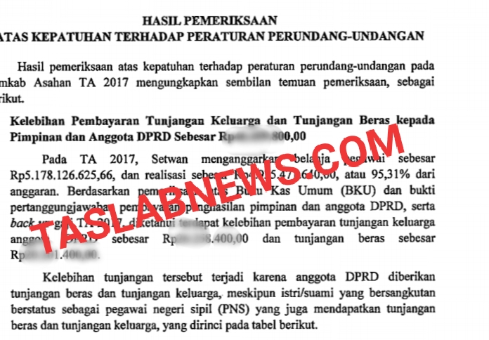 TASLABNEWS, ASAHAN- Ternyata selain belum memulangkan 17 unit laptop, pembayaran tunjangan reses yang tak sesuai ketentuan, pembayaran tunjangan keluarga dan beras anggota DPRD juga jadi temuan Badan Pemeriksa Keuangan (BPK).