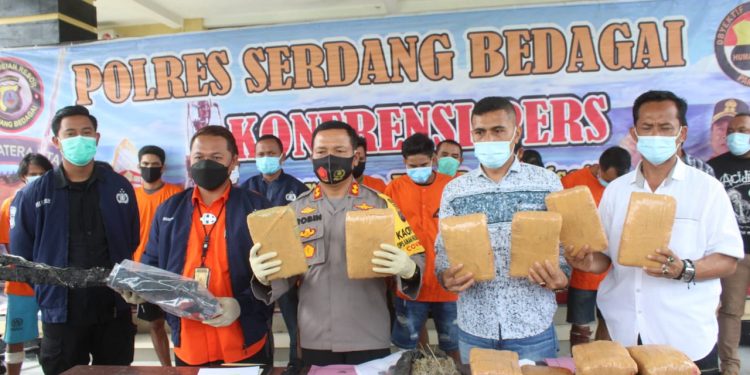 “Dilakukan Penyelidikan, petugas berhasil melakukan pengangkapan kepada tersangka dan barang bukti Narkoba jenis daun ganja seberat 14,2 Kg berada dibawah bangku mobil Inova BK 1949 GD,” kata AKBP Robin saat Konferensi Pers, di halaman Mapolres Sergai, Sabtu (05/12/2020) pagi.