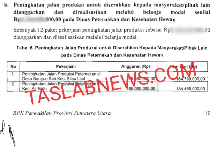 TASLABNEWS, ASAHAN- Ternyata dari 12 proyek bermasalah di Dinas Peternakan dan Kesehatan Hewan (PKH), salahsatunya adalah Peningkatan Jalan Produksi Peternakan di Kecamatan Air Batu Rp185 Juta.