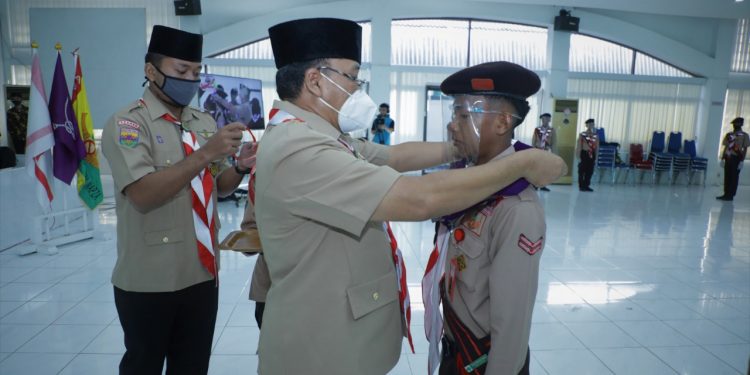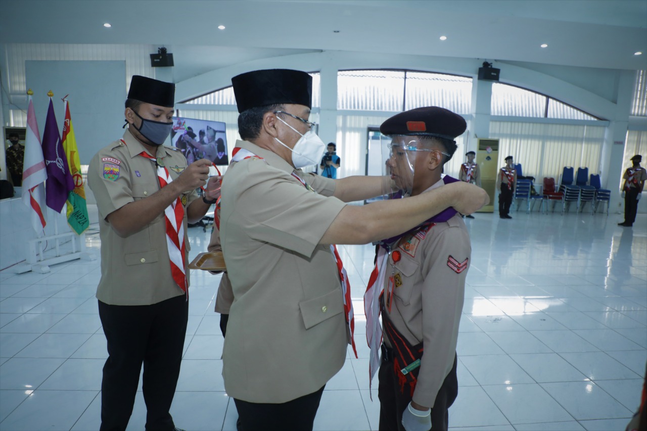 Dikesempatan ini Sekda kabupaten Asahan memberikan Lencana Peserta secara simbolis kepada peserta pramuka penggalang. (RIL/Syaf)