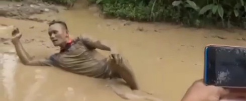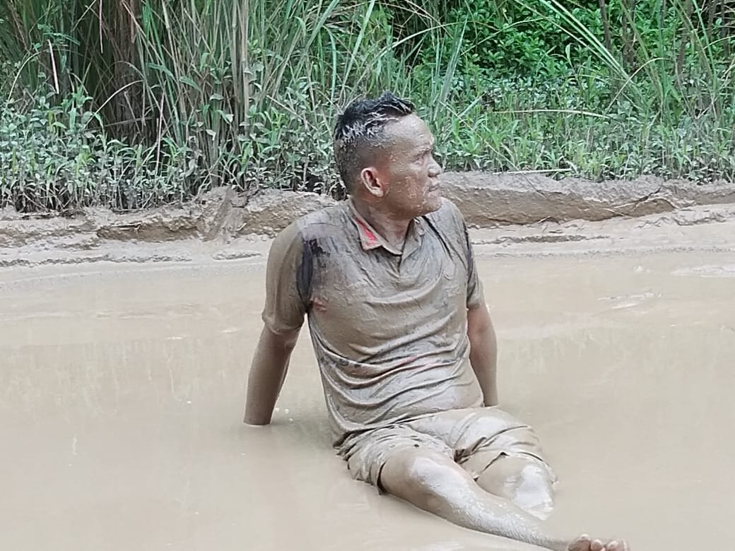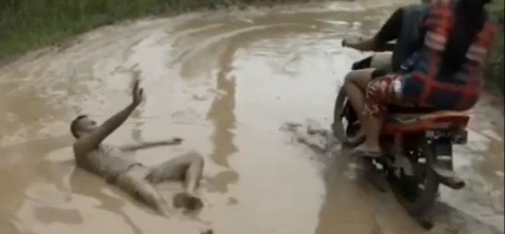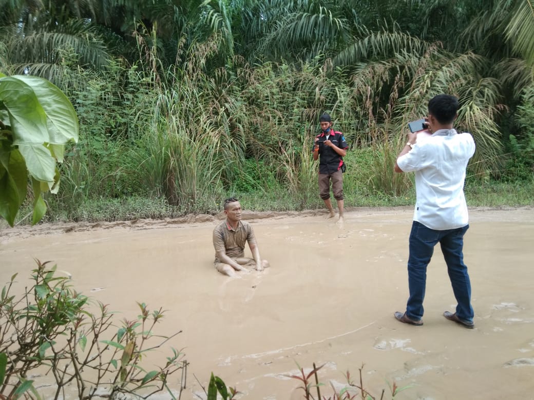 Malah Dirman Marpaung (40) nekad melakukan aksi protes dengan cara berendam dan berpose bak model di kubangan jalan yang penuh lumpur. Hal tersebut sontak menjadi perhatian warga dan pengendara sepedamotor yang tengah melintasi jalan tersebut.
