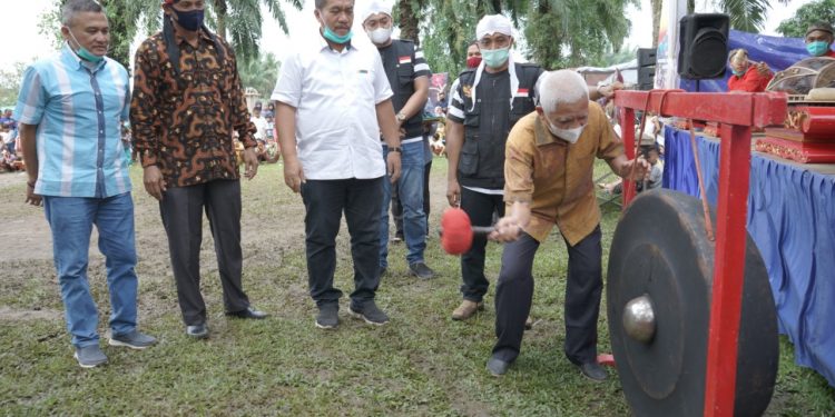 TASLABNEWS, ASAHAN-Bupati Asahan H Surya BSc bersama Taufik Zainal Abidin Siregar, perwakilan Dandim 0208 Kabupaten Asahan Kapten Inf Nuryanto, menghadiri gebyar Seni Budaya Reog Gembong Bawono di Jalan Langsat Kelurahan Sentang Kecamatan Kisaran Timur, Sabtu (02/01/2021).