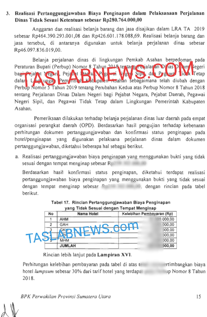 TASLABNEWS, ASAHAN-Berdasarkan hasil pemeriksaan yang dilakukan BPK, pejabat di Setdakab Asahan, Dinkes, PMD dan Setwan menginap di lima hotel yakni Hotel AHM, GAH, GKH, LPH dan MHM.