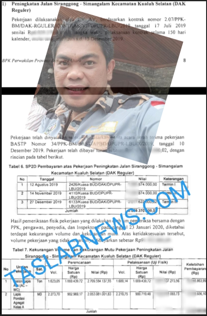 TASLABNEWS, LABURA-Ternyata ada kekurangan volume pengerjaan Jalan di Siranggong-Simangalam di PUPR Labura dengan nilai Rp6,029 Miliar.