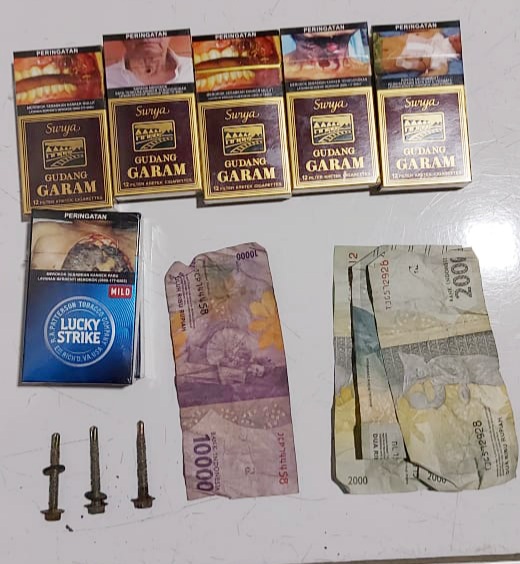 Sedangkan dari tangan tersangka Andi, petugas mengamankan barang bukti berupa lima bungkus rokok Surya 12 batang, dua bungkus rokok Lucky Strike 16 btg dan uang tunai senilai Rp16.000.
