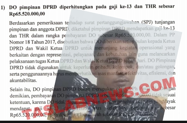 Menurut Isa, kelebihan pembayaran gaji ke 13 dan THR itu sebesar Rp65.520.000. Dalam temuan BPK diketahui, dimana setiap bulannya pimpinan DPRD dan Wakil menerima Dana Operasional (DO) setiap bulannya.