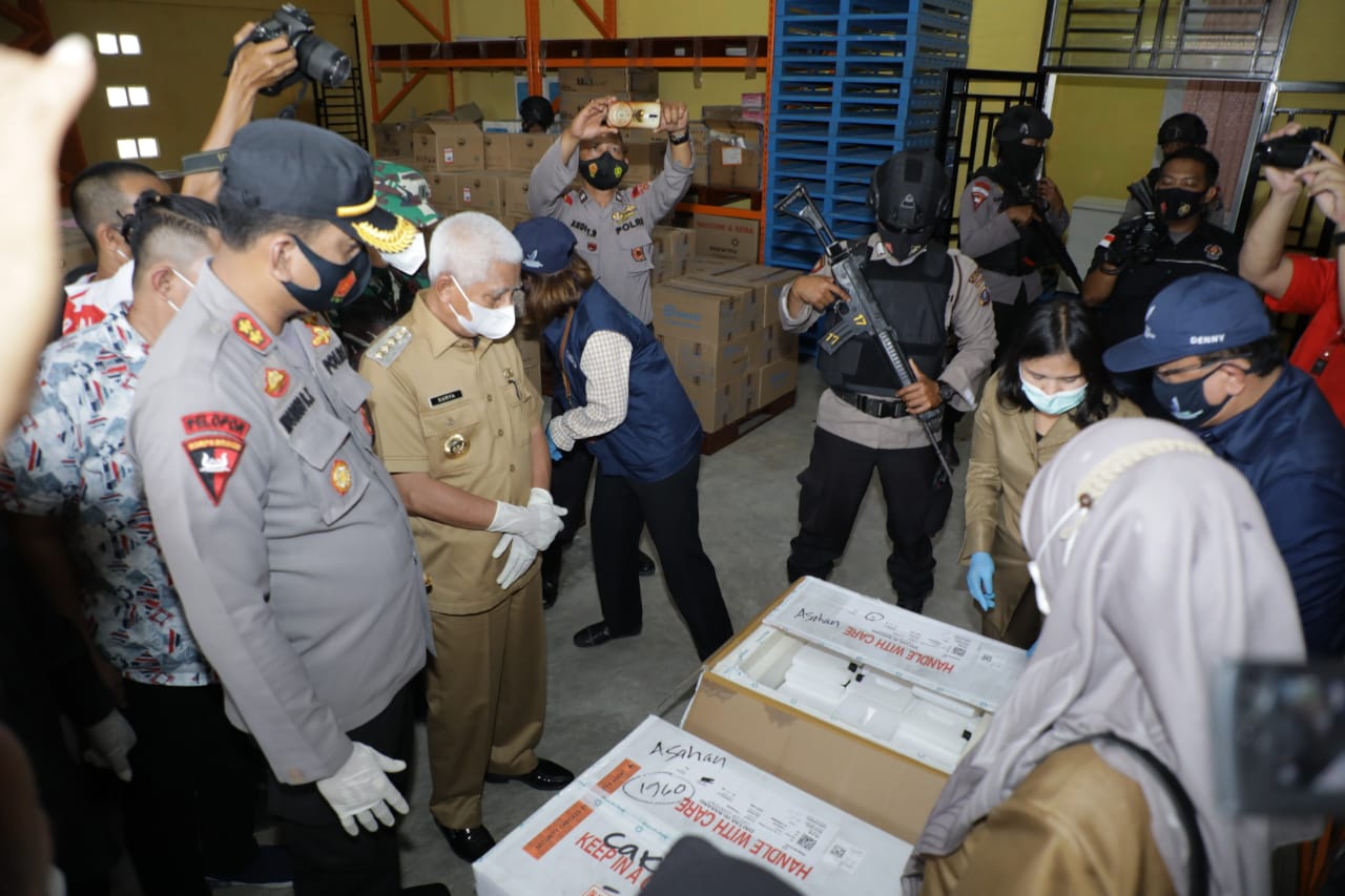 Bupati Asahan, H Surya BSc didampingi Ketua DPRD, Kapolres Asahan, Kepala Kejaksaan, Danlanal Tanjung Balai Asahan, dan perwakilan Dandim 0208/AS menerima 4.440 Vaksin Sinovac (vaksin Covid-19), di gudang Instalasi Farmasi Jalan Durian, Kisaran, Kabupaten Asahan.