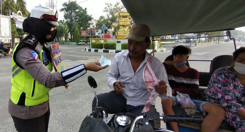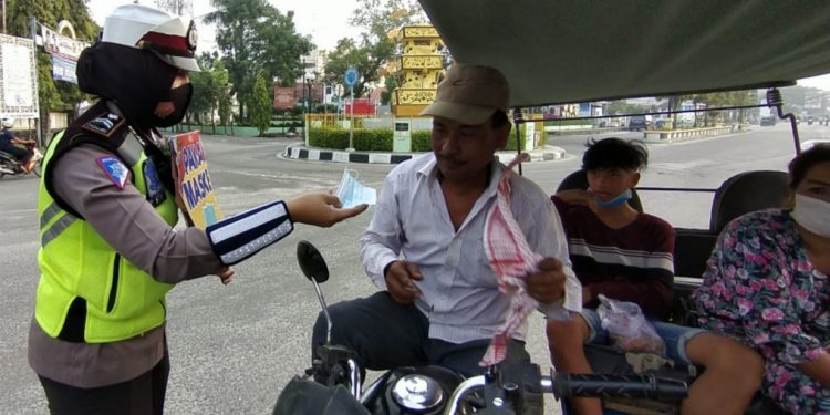 Selain membagikan masker yang dilaksanakan di kawasan Jalan Gereja, Kota Tanjungbalai, personil Sat Lantas Polres Tanjungbalai juga mengimbau para pengguna jalan agar terbiasa memakai masker agar dapat mencegah penyebaran Covid-19.
