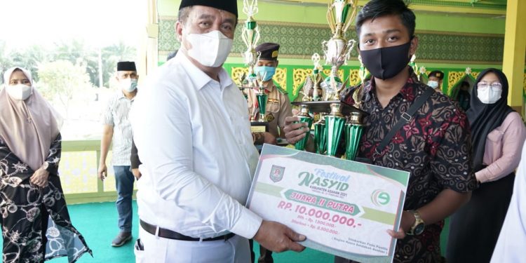 Wakil Bupati Asahan Taufik Zainal Abidin Siregar SSos MSi menutup Festival Seni Nasyid Tingkat Kabupaten Asahan Tahun 2021 di Gedung Tahfidz Masjid Agung H Ahmad Bakrie Kisaran, Sabtu (27/02/2021).