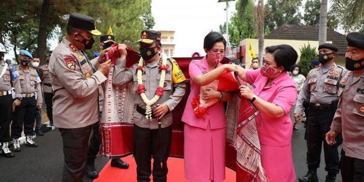 Irjen Pol RZ Panca Putra beserta istri turut menerima pengalungan bunga kemudian dilanjutkan dengan pemakaian Ulos Batak oleh Irjen Pol Martuani Sormin beserta istri.