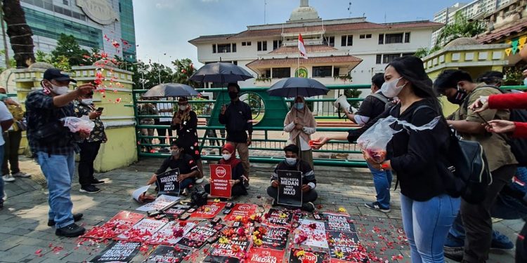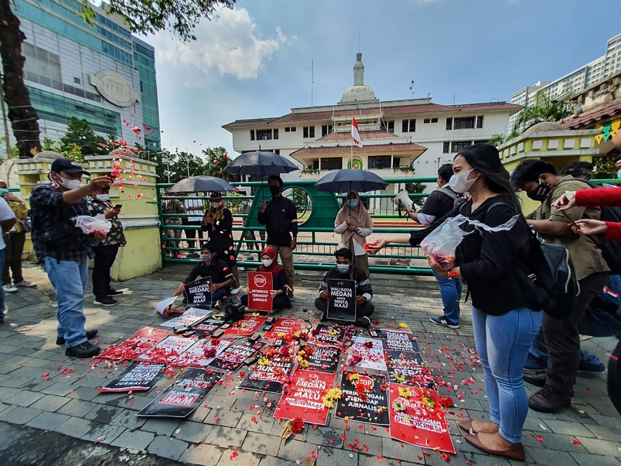 “Payung hitam dan tabur bunga adalah bentuk duka mendalam atas matinya demokrasi dan kebebasan pers di Kota Medan,” ungkap Donny Aditra, koordinator aksi.