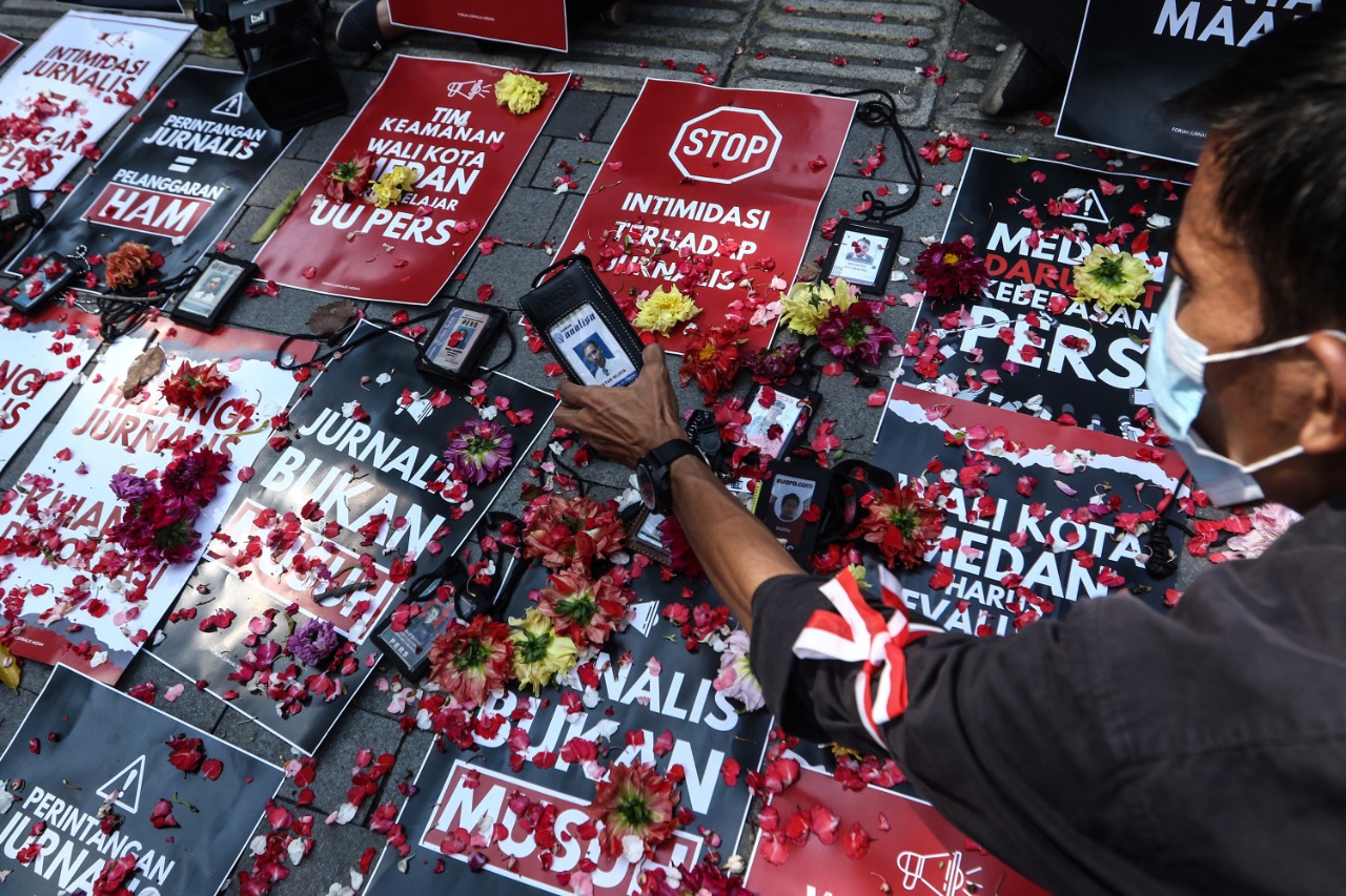 Aksi yang dilakukan para jurnalis tetap mematuhi protokol kesehatan di tengah pandemik COVID-19. Massa tetap menjaga jarak dan memakai masker.