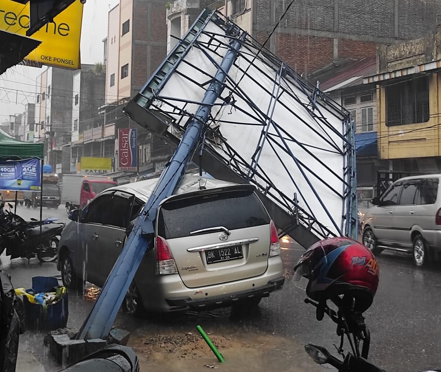 TASLABNEWS, LABURA – Hujan deras disertai angin kencang yang melanda bumi Kabupaten Labuhanbatu Utara (Labura), mengakibatkan papan reklame rokok tumbang, Senin (5/4/2021) sore dan menimpa mobil Kijang Innova BK 1522 AL. Tidak ada korban jiwa akibat peristiwa itu.