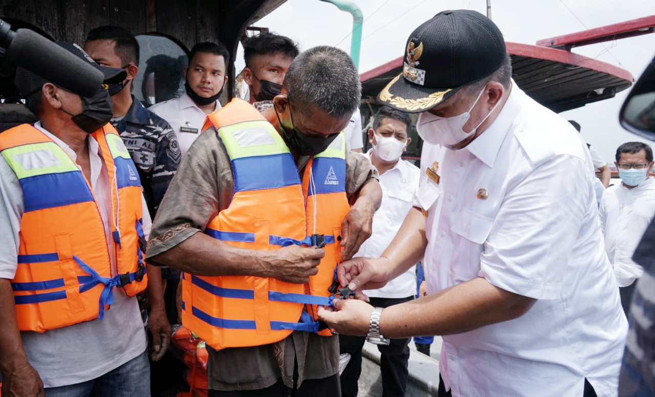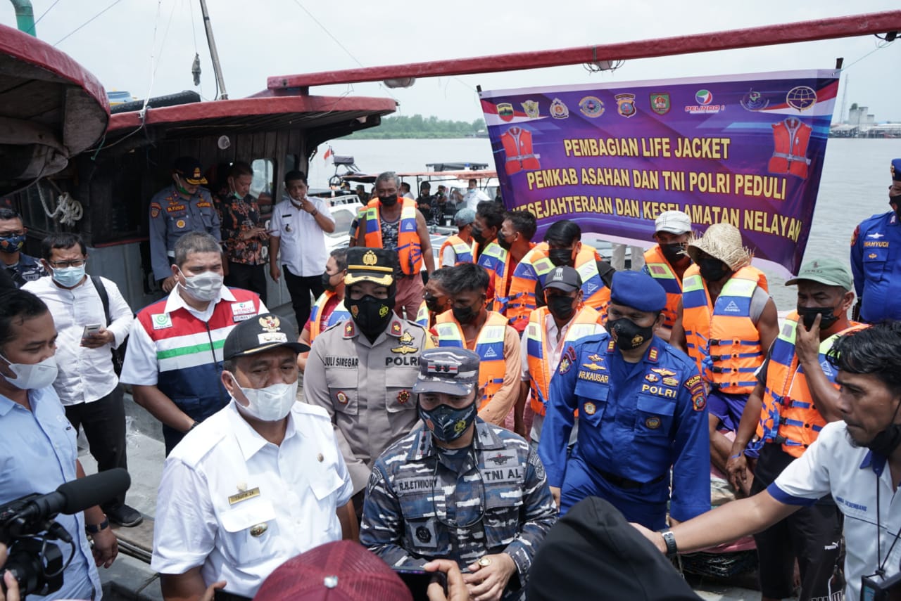 Dalam peninjauan potensi maritim yang ada di perairan Bagan Asahan, Wakil Bupati beserta rombongan membagikan life jacket kepada 100 Nelayan.