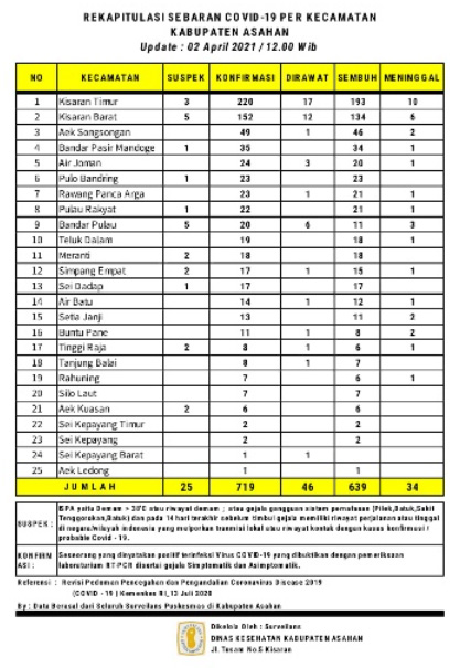 Disebutkannya, data tersebut berdasarkan hasil data surveilans seluruh Puskesmas yang ada di wilayah Kabupaten Asahan sebagaimana dikelola Dinas Kesehatan Kabupaten Asahan pertanggal 2 April 2021 hingga pukul 12.00 Wib.