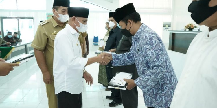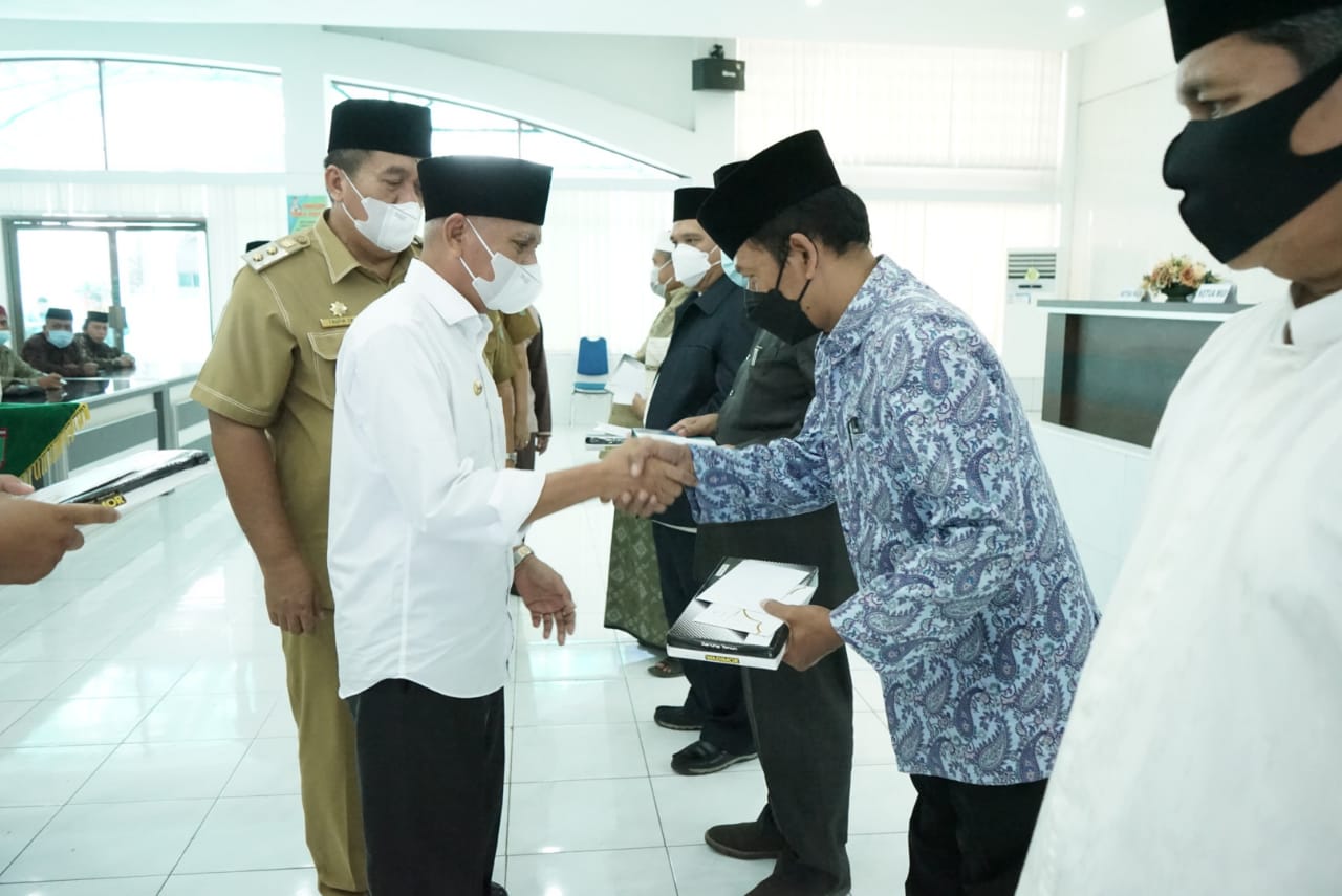 TASLABNEWS, ASAHAN-Bupati dan Wakil Bupati Asahan didampingi oleh Pj Sekretaris Daerah Kabupaten Asahan dan Asisten Perekonomian dan Pembangunan memberikan penali kasih dan bingkisan kepada para Ustadz yang diserahkan secara simbolis.