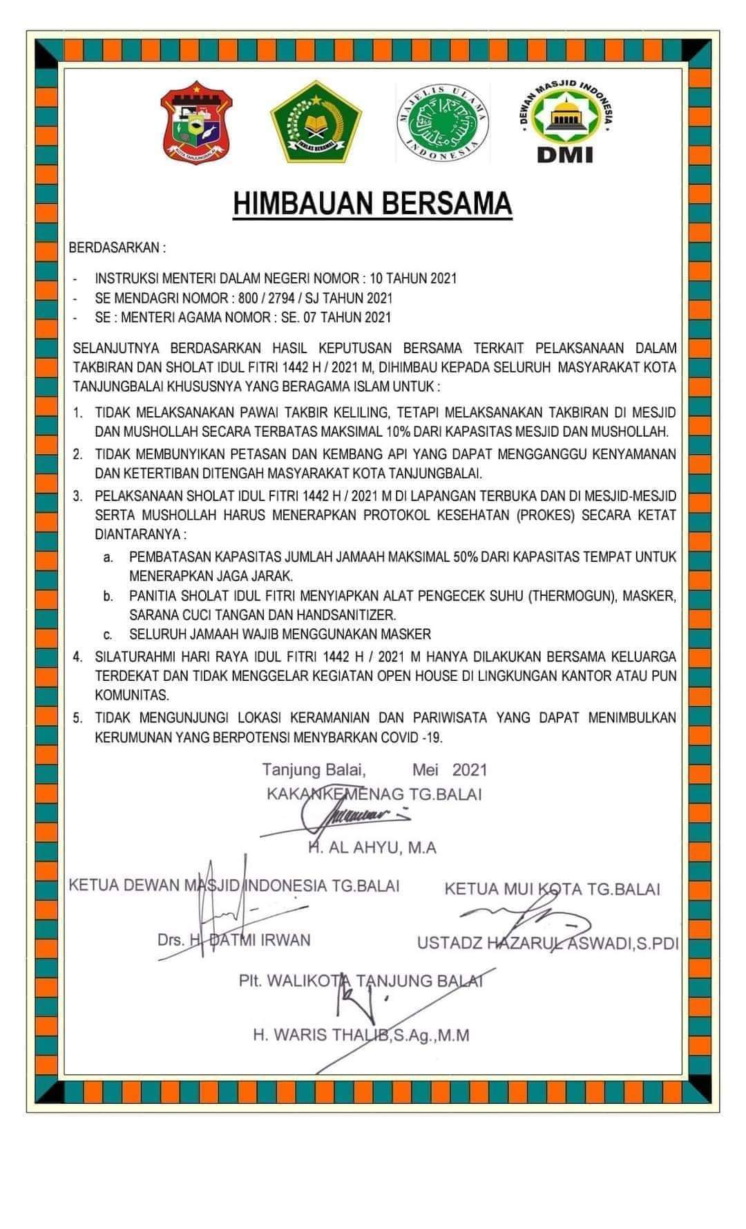 TASLABNEWS, TANJUNGBALAI – Pada masa pandemi Covid-19 sekarang ini, untuk menjaga Keselamatan dan Kesehatan Warga Kota Tanjung Balai, Majelis Ulama Indonesia (MUI) Dan Dewan Masjid Indonesia (DMI) Kota Tanjung Balai mengimbau Warga Kota Tanjungbalai untuk tidak takbir keliling, cukup di masjid saja.