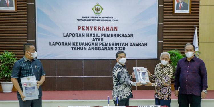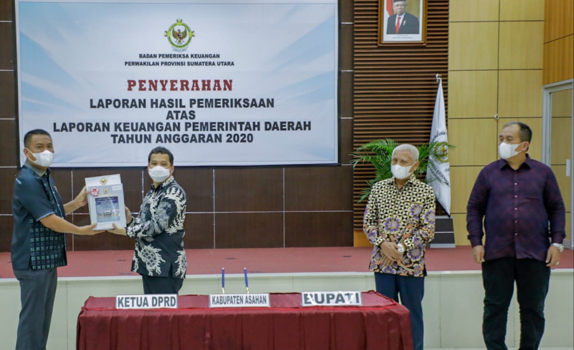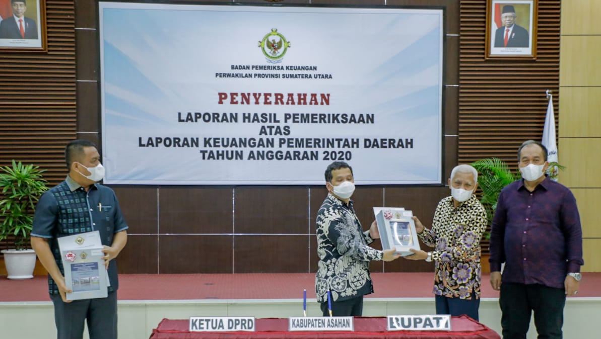 Bupati Asahan, H Surya BSc menerima langsung opini wajar tanpa pengecualian (WTP) dari BPK Perwakilan Provinsi Sumatera Utara (Sumut) atas LKPD Asahan Tahun Anggaran 2020.