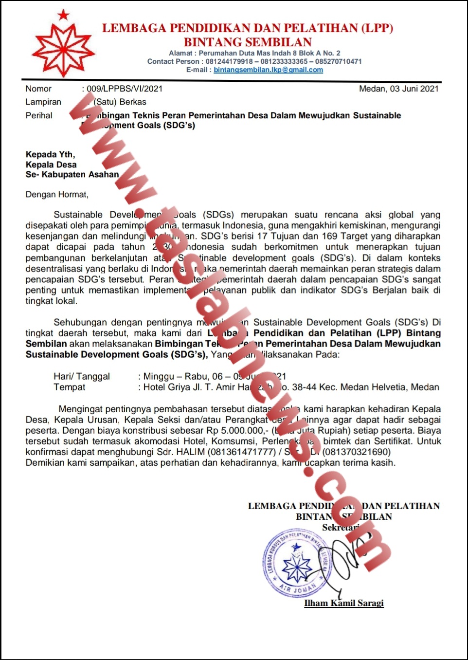 “Tidak ada alamat lengkap maupun nomor izin LPP Bintang Sembilan pada surat undangan yang dikirimkan melalui aplikasi WhatsaApp (WA) kepada seluruh Kepala Desa di Kabupaten Asahan,” tukas Aan.