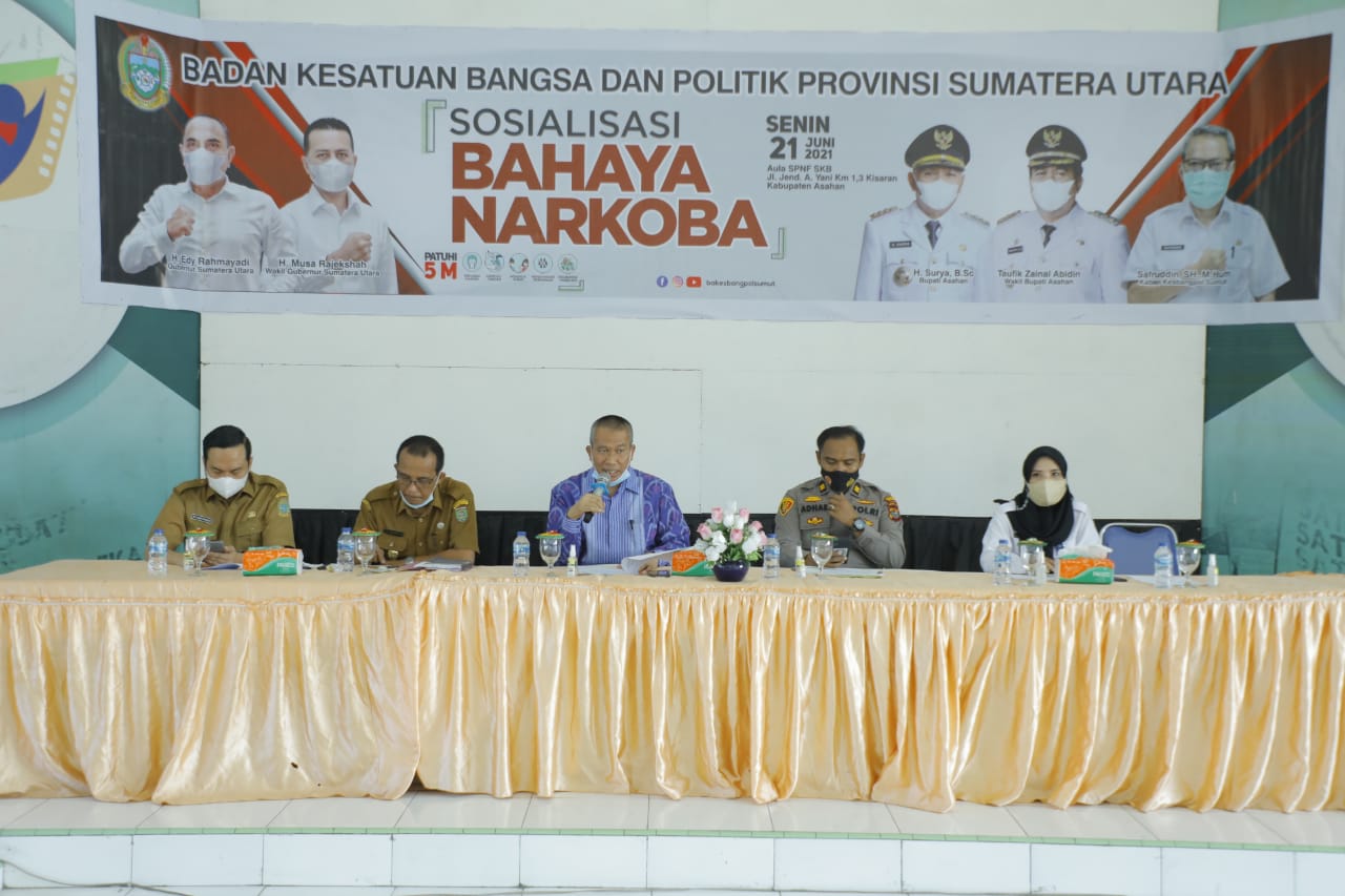 Hal itu disampaikan saat Badan Kesatuan Bangsa dan Politik (Kesbangpol) Provinsi Sumatera Utara (Provsu) bekerja sama dengan Kesbangpol Kabupaten Asahan menggelar Sosialisasi Bahaya Narkoba di Aula Pendidikan Kabupaten Asahan, Senin (21/06/2021).