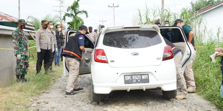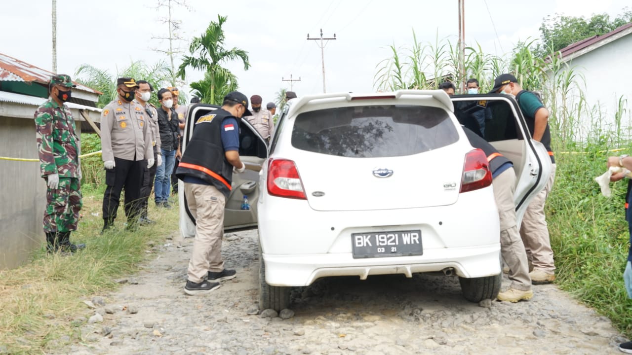 Dilokasi yang masih diterpasang tali kuning yang bertuliskan Police Line itu, para petugas yang mengenakan rompi hitam bertuliskan LABFOR di bagian punggung belakang itu tampak dengan serius melakukan pemeriksaan Mobil City Car Datsun Go berwarna Putih dengan Nopol BK 1921 WR milik korban.