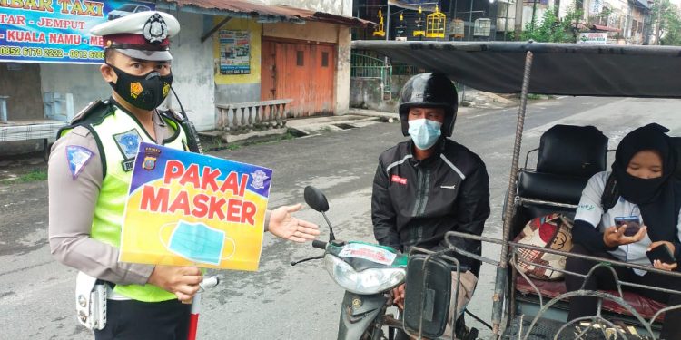 TASLABNEWS, TANJUNGBALAI – Inilah sosialisasi ‘Ayo Pakai Masker’ untuk hidup sehat dan terhindar dari Corona Virus Desease 2019 atau lebih dikenal dengan nama Covid-19 alanya Sat Lantas Polres Tanjungbalai yakni dengan main tempel stiker.