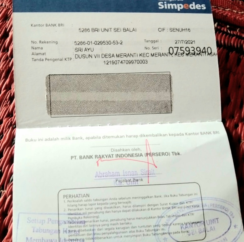 Foto buku rekening atas nama anak Nek Muriatik, Sri Ayu.