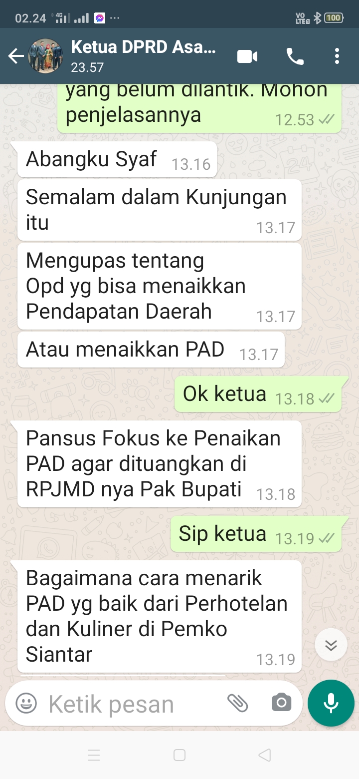 “Abangku Syaf, Semalam dalam Kunjungan itu mengupas tentang OPD yang bisa menaikkan Pendapatan Pansus Fokus ke Penaikan PAD agar dituangkan di RPJMD nya Pak Bupati. Bagaimana cara menarik PAD yang baik dari Perhotelan dan Kuliner di Pemko Siantar. Itulah Abangku,” jawabnya.