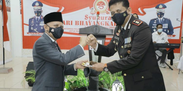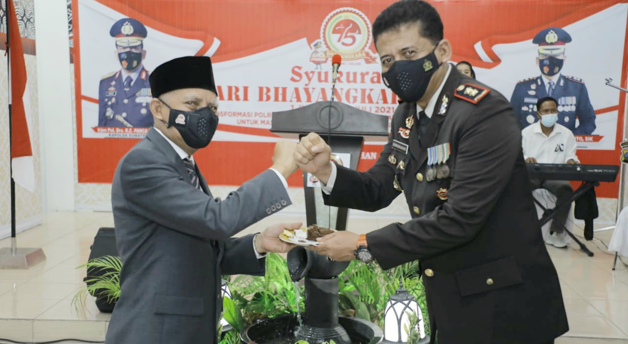 Kapolres Asahan membacakan pidato Kapolri, mengatakan bahwa sesuai dengan tema Hari Bhayangkara ke-75 Tahun 2021, yaitu ‘Kamtibmas kondusif, masyarakat semakin produktif’, maka Polri berkomitmen untuk melaksanakan setiap kebijakan dalam tatanan kehidupan baru ditengah pandemi covid-19.