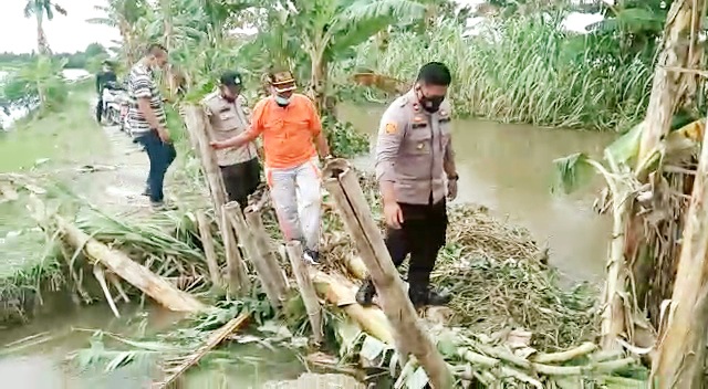 Turut mendampingi Kapolsek Kota Kisaran, Babinkantimas dan Perangkat Desa Meranti, berkeliling mengunjungi tempat terdampak banjir. (edi/mom)