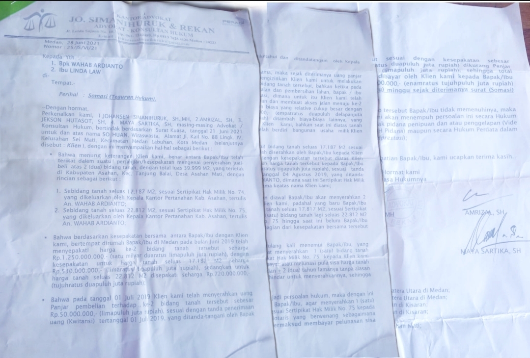 Pada surat somasi tersebut menjelaskan tentang ikatan perjanjian penyerahan jual beli dua bidang tanah seluas 39.999 M2, berlokasi di Desa Asahan Mati, Kecamatan Tanjungbalai, Asahan.