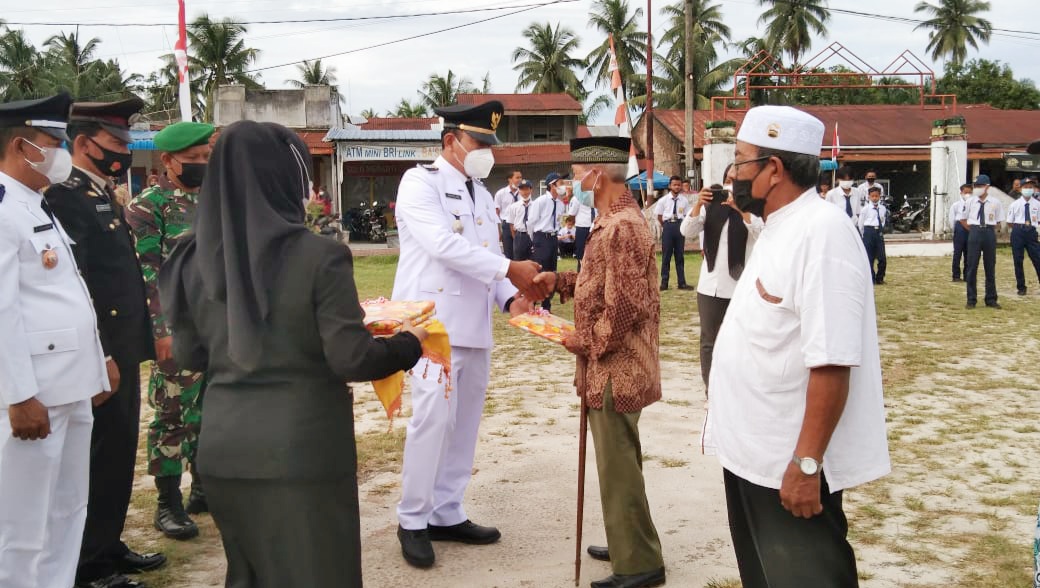 Upacara yang dilaksanakan dalam waktu hanya setengah jam, tanpa ada kata sambutan dari Camat Meranti, hanya pengibaran Bendera Merah Putih dilanjutkan dengan pembagian bingkisan kepada tokoh masyarakat yang elah mengabdi tanpa pamrih.
