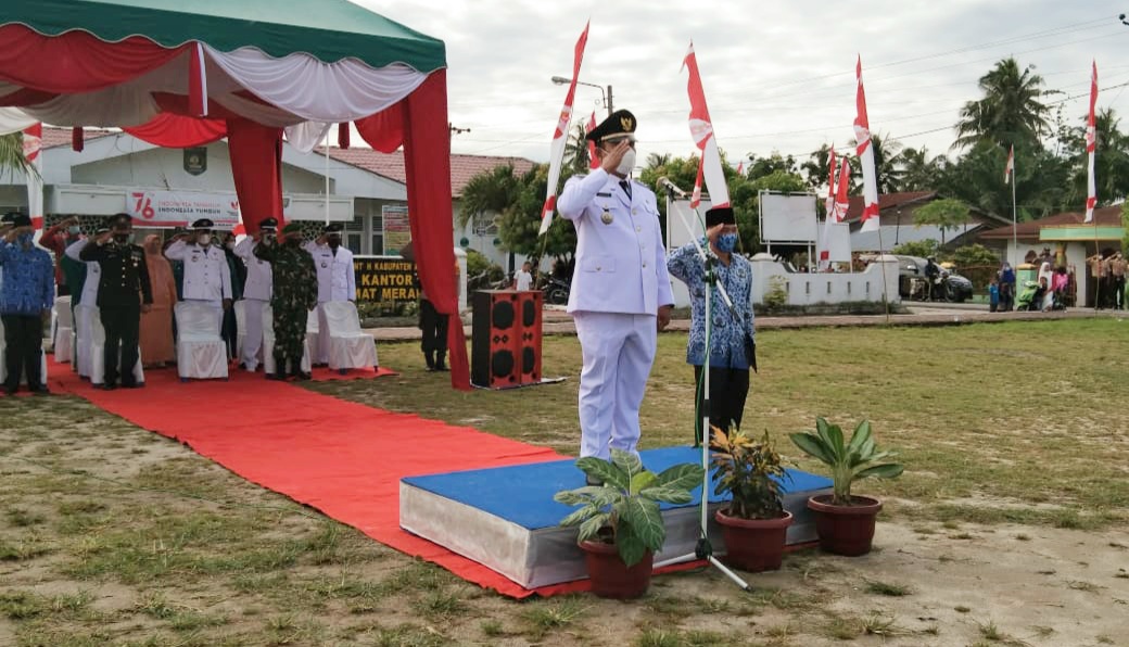 Dalam upacara pengibaran Bendera Merah Putih dalam rangka Hari Kemerdekaan RI ke-76 di Kecamatan Meranti, bertindak sebgai Pembina Upacara, Camat Meranti dan Komandan Upacara, Babinsa Meranti, Sertu B Napitupulu.