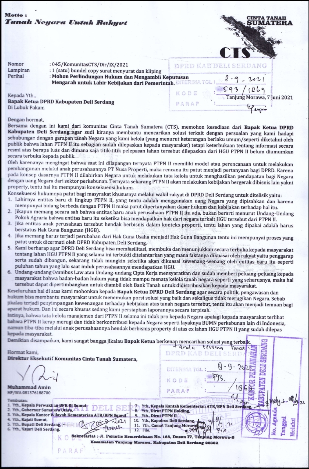 TASLABNEWS, DELI SERDANG – Komunitas Cinta Tanah Sumatera (CTS), resmi melayangkan surat kepada Ketua DPRD Kabupaten Deliserdang di Lubukpakam, untuk membantu mencarikan solusi terkait persoalan garapan tanah Negara yang mereka kelola sesuai dengan menurut keterangan berlaku umum/seperti diketahui oleh publik, bahwa lahan PTPN2 itu sebagian sudah dilepaskan kepada masyarakat.