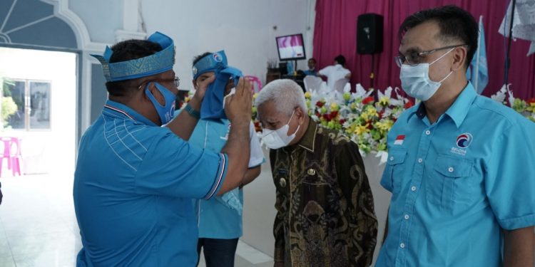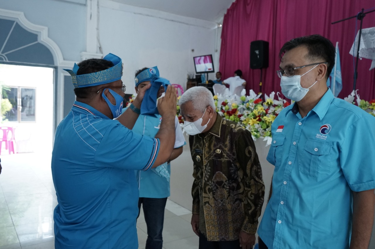 TASLABNEWS, ASAHAN-Ketua DPD Partai Gelora Indonesia (PGI) Kabupaten Asahan menyematkan tanjak kepada Sekretaris DPW Partai Gelora Indonesia Sumatera Utara dan Bupati Asahan disaksikan oleh pengurus DPD Partai Gelora Indonesia Kabupaten Asahan dan tamu undangan lainnya.