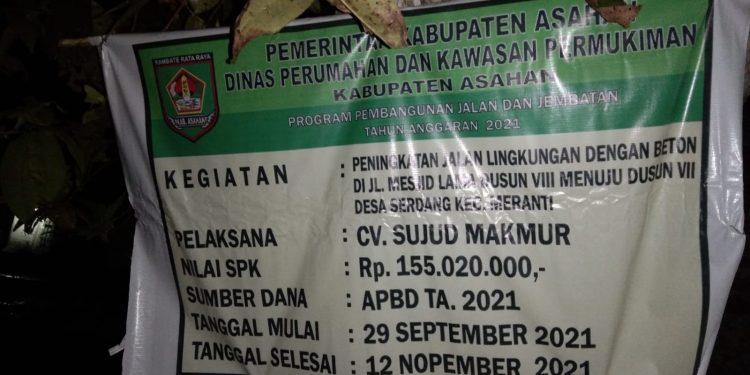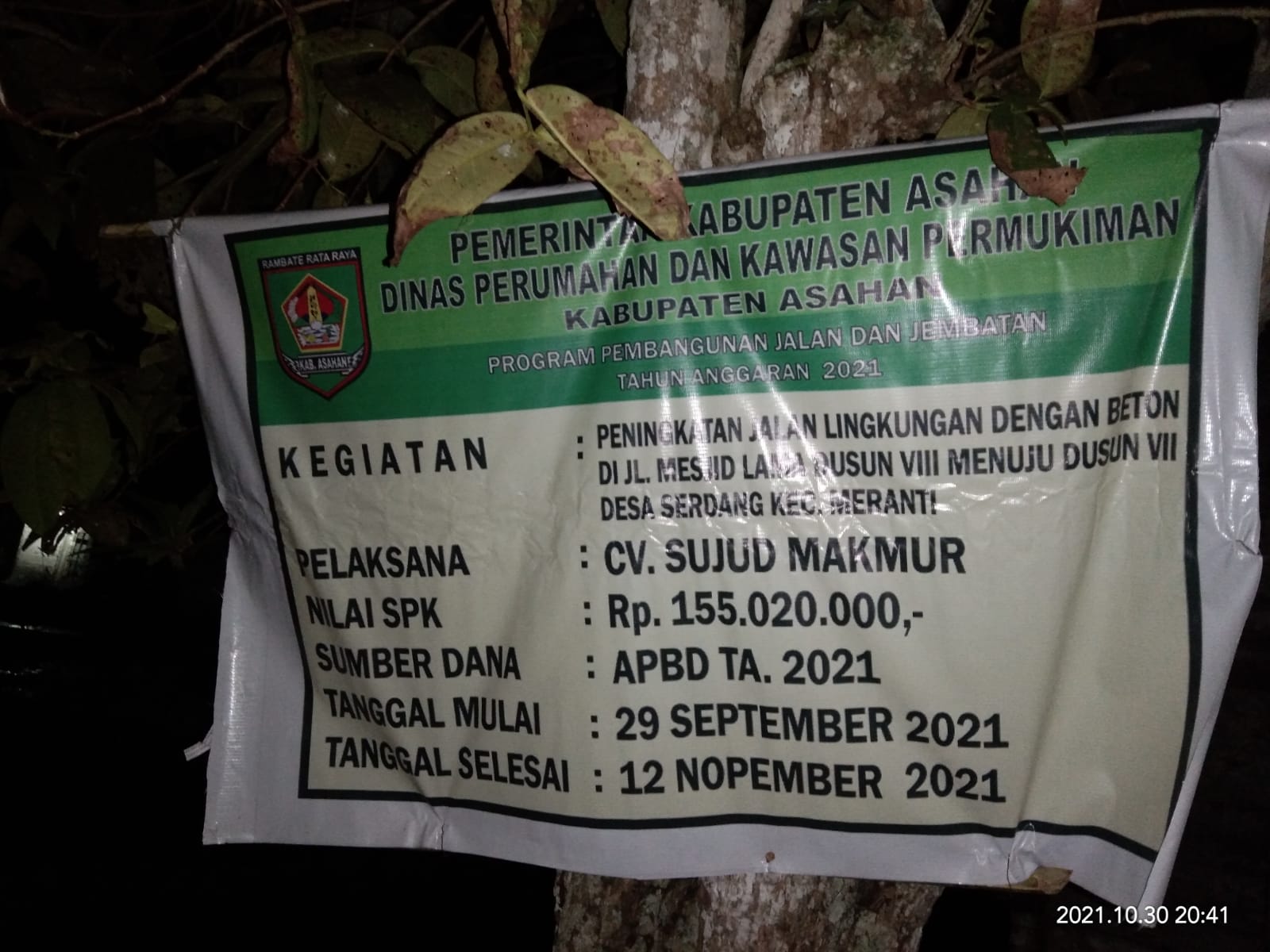 Dari pantauan awak media Minggu (31/10/2021), pembangunan rabat beton yang berada di Desa Serdang Dusun 8, Kecamatan Meranti di kerjakan oleh CV SUJUD MAKMUR dengan anggaran Rp155.020.000 anggaran tahun 2021 dari dinas Perkim.