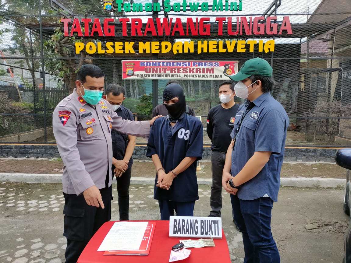Tersangka diringkus personel Tekab Polsek Medan Helvetia. Dalam menjalankan aksinya, modus tersangka numpang nginap di rumah temannya dan mobil Suzuki Swif warna biru Tahun 2008 milik korban dicuri pelaku, Kamis (29/09/2021).